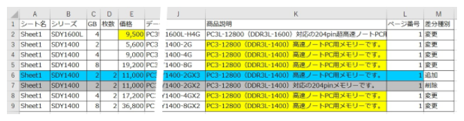 原稿差分Excelのセル色は、黄が変更、青が追加、グレーが削除を意味します。